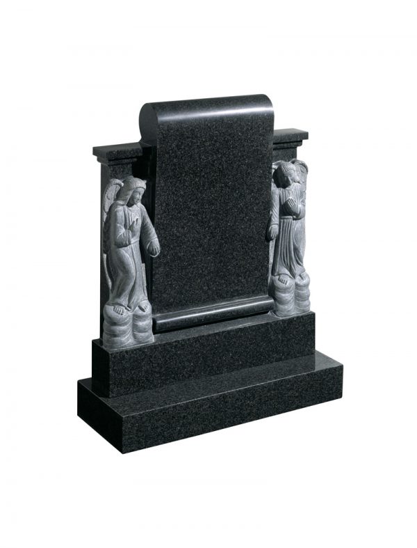 Two hand carved Angels at either side of a scroll.